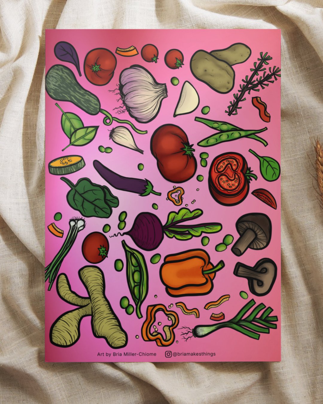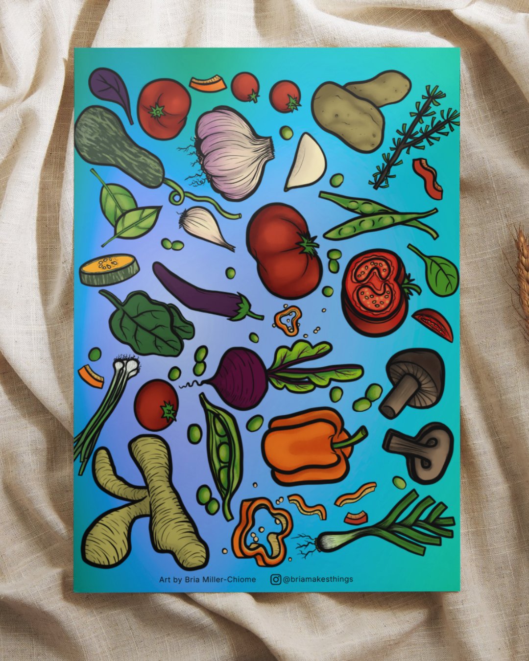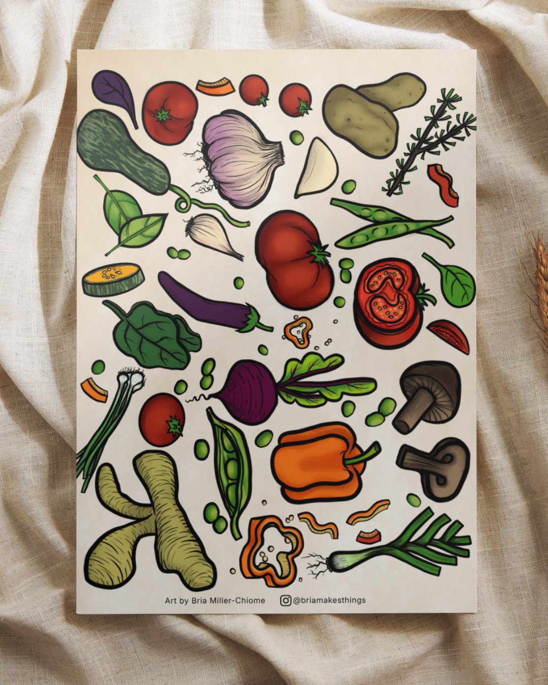 This illustration was inspired by the vegetables and herbs I harvested in my garden later this past Summer and Fall. I grow a lot of culinary and medicinal herb plants that I use in my cooking often, or to make teas. It is one of the many ways I love to be creative. Making different flavor blends is one of my favorite things.